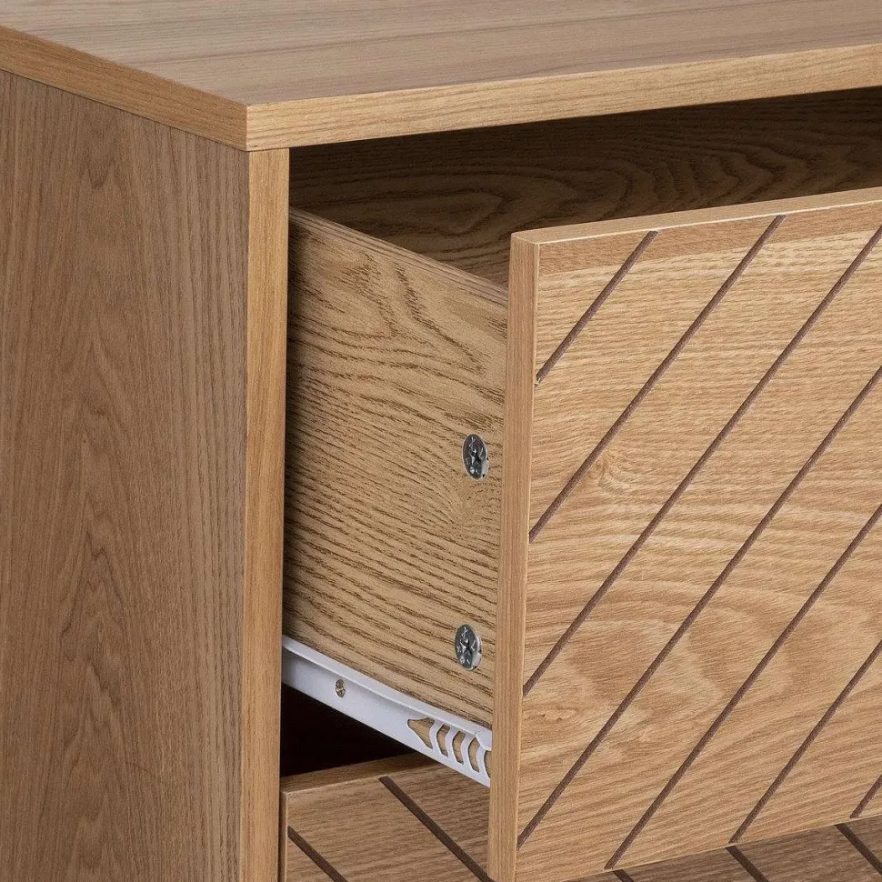 Structure + Tiroirs / Mdf E1 – Panneau De Fibres De Bois / 75 % / Pieds + Poignees / Fe – Fer / 10 % / Placage / Frene / 15 % /